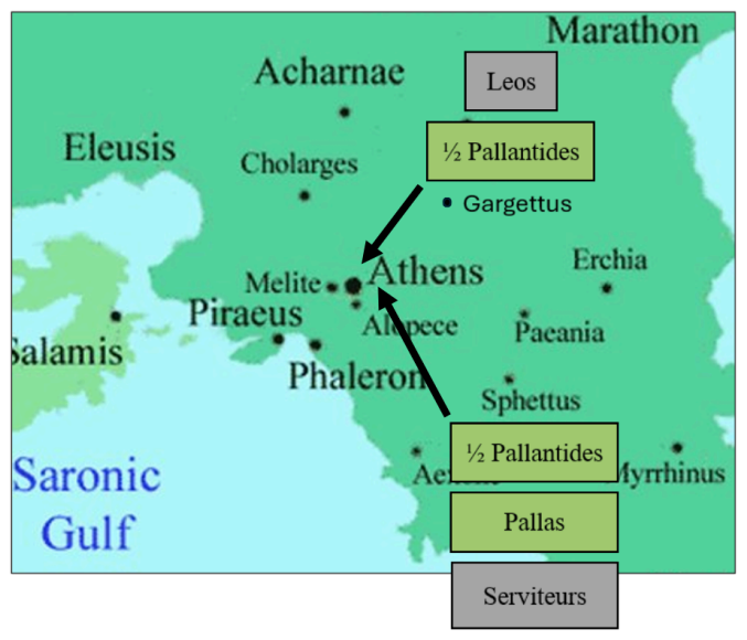 Ils prirent alors la décision d’attaquer la ville. Ils formèrent deux groupes : l’un se posta en embuscade au village de Garguettus, avec la moitié des Pallantides et leur porte-parole Leos, tandis que l’autre se rassembla à Sphettus, prêt à remonter vers Athènes. Ce dernier groupe était composé de l’autre moitié des Pallantides, de Pallas et de serviteurs.